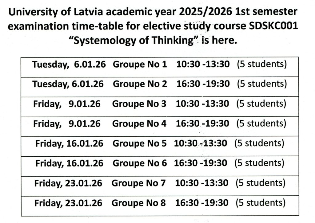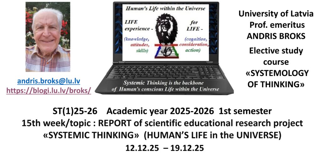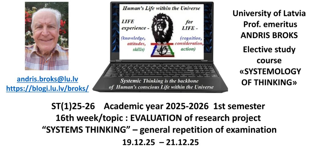 *************************************UZMANĪBU – šeit turpinājumā Jums pieejams atskats 2023-2024. akadēmiskā gada otrā semestra studiju kursa “Domāšanas sistemoloģija” materiālos (latviešu un angļu valodās)