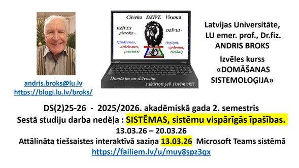 *************************************UZMANĪBU – šeit turpinājumā Jums pieejams atskats 2023-2024. akadēmiskā gada otrā semestra studiju kursa “Domāšanas sistemoloģija” materiālos (latviešu un angļu valodās)