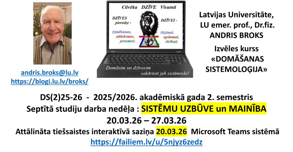Šis ir izvēles studiju kurss “DOMĀŠANAS SISTEMOLOĢIJA” (no 2002) It’s elective study course “SYSTEMOLOGY OF THINKING” (from 2002)