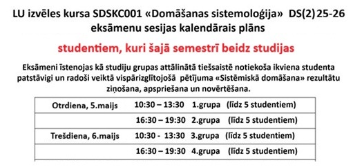 Studenti, kuri šajā semestrī beidz studijas, šī izvēles kursa eksāmenu kārtos otrdien, 5.05.26 un trešdien 6.05.26. Pieteikšanās savlaicīgi līdz piektdienai, 24.04.26.